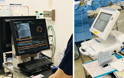 冠動脈造影(CAG)や、経皮的冠動脈形成術(PCI)、末梢血管インターベンション(EVT)、において、血管内超音波検査(IVUS)や光干渉断層法(OCT)、冠血流予備量比(FFR)、補助循環装置(IABP、PCPS)、体外式ペースメーカー、ポリグラフなどの操作、保守・管理、デバイスの選定や準備を行っています。患者さんに安心して検査を受けていただけるようチームの一員としてサポートを行っています。