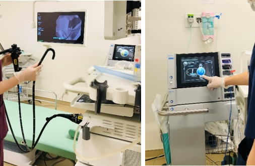 臨床工学技士は、スコープの管理や内視鏡システムの機器管理、処置や治療に使用する処置具の管理、検査の介助を行っています。消化器内視鏡技師を取得した臨床工学技士が複数名内視鏡センターに常駐することで専門性を高めています。