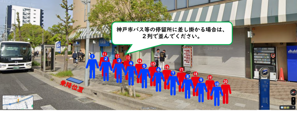②列が東側の市バス等停留所に差し掛かる場合は、2列で並んでください。