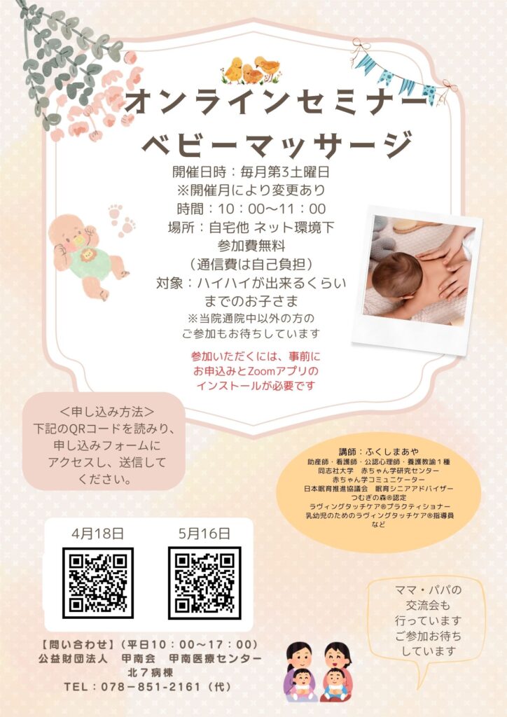 ベビー人形を使ってのセミナーとなっており、着衣でのベビーマッサージとなります。事前にオイル等を用意していただく必要はありませんので、お気軽にご参加ください。