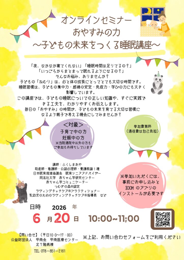 当院の助産師が、子どもの睡眠について正しい知識や、すぐに実践できる工夫を、わかりやすくお伝えします。開催日程につきましては、下記リーフレットをご確認ください。