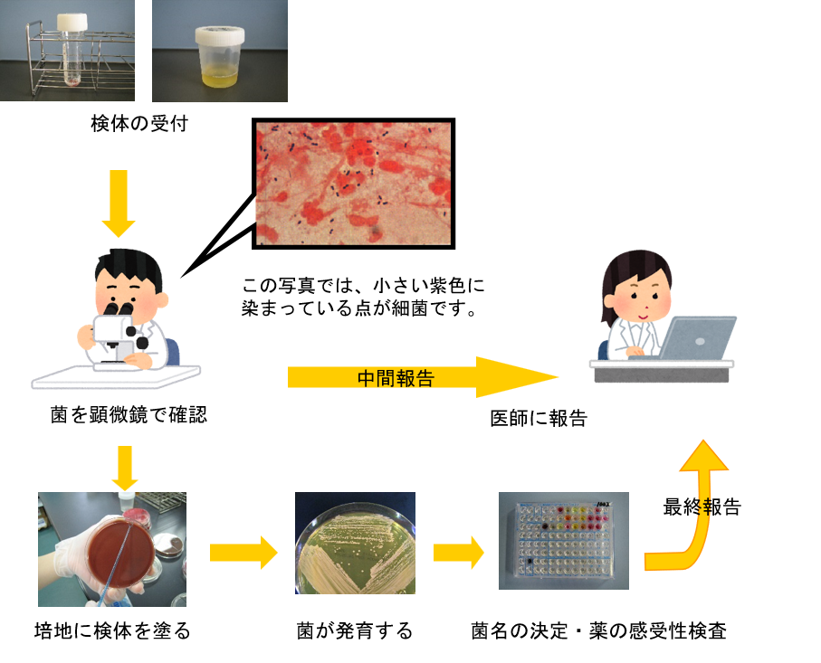 採取した検体を直接顕微鏡で観察し、細菌の観察を行います(塗抹鏡検)。次に検体の種類や予測される細菌によって、適切な培地や培地条件を選び、培養します。培養で育った細菌の塊(コロニー)をもとに、細菌の名前を調べます(同定検査)。その後、その細菌に効く薬と効かない薬を調べていきます(感受性検査)。